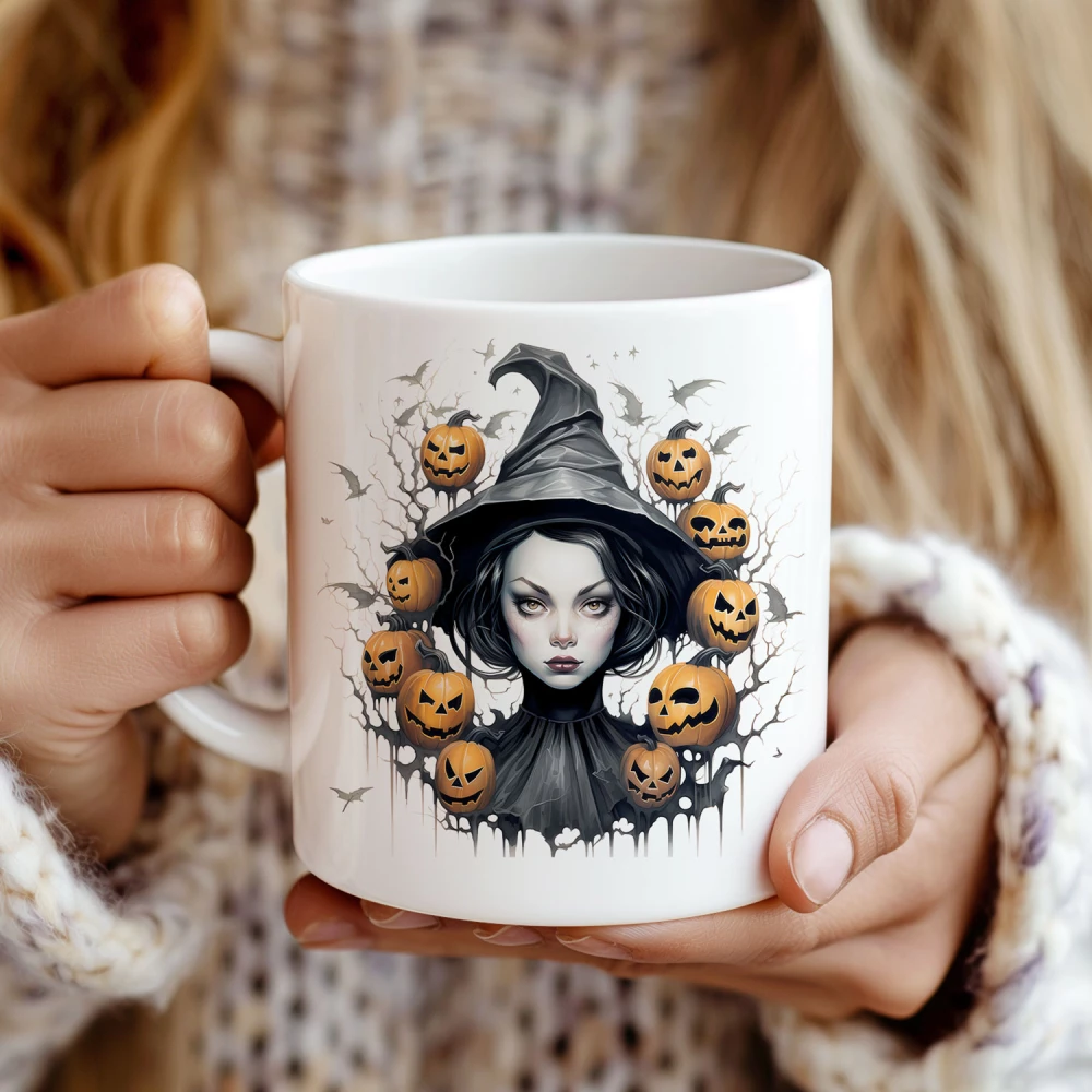 For those who thrive on moonlight, mystery, and a little mischief—this mug is pure Halloween magic. The “Pumpkin Witch” design features a striking dark witch surrounded by glowing jack-o’-lanterns, blending spooky charm with haunting elegance. It’s the perfect way to stir a little enchantment into your morning brew or midnight tea ritual.Crafted from high-quality ceramic, this 11oz mug is made to withstand countless brews, spells, and cozy nights in. The detailed sublimation print keeps every eerie element sharp and vibrant—no fading, no peeling, just pure gothic perfection. Whether you’re a witch at heart or just obsessed with all things spooky, this mug will be your new favourite companion.Product Highlights: