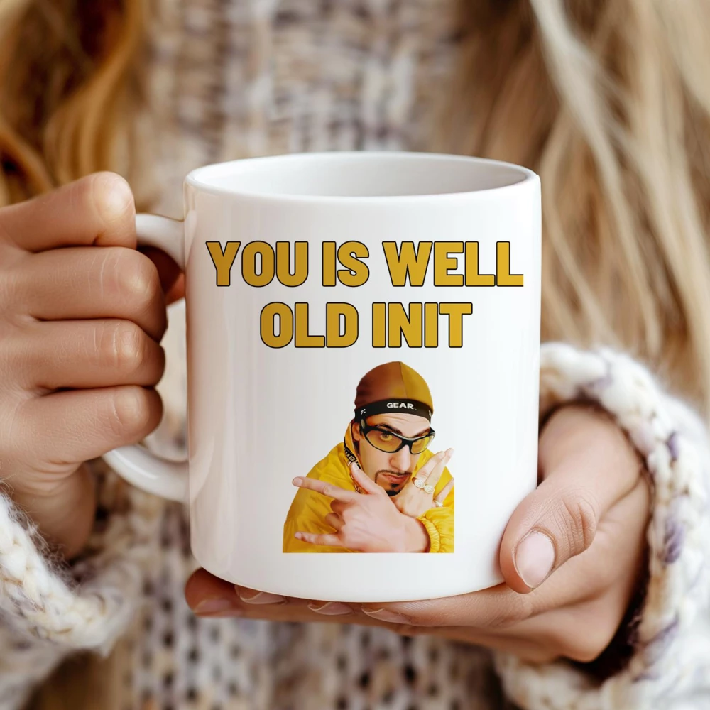 "You Is Well Old Init" Mug | 11oz Ceramic MugAdd some humor to your day with this playful "You Is Well Old Init" mug! Perfect as a fun gift or a quirky addition to your own collection, this mug is sure to bring a smile to anyone’s face.Crafted with high-quality ceramic, this 11oz mug is both durable and stylish, making it ideal for your morning coffee, tea, or any favourite drink. The vibrant, high-quality sublimation print ensures a scratch-proof and long-lasting design. Plus, it's dishwasher safe, so you can enjoy it every day with ease!Product Details: